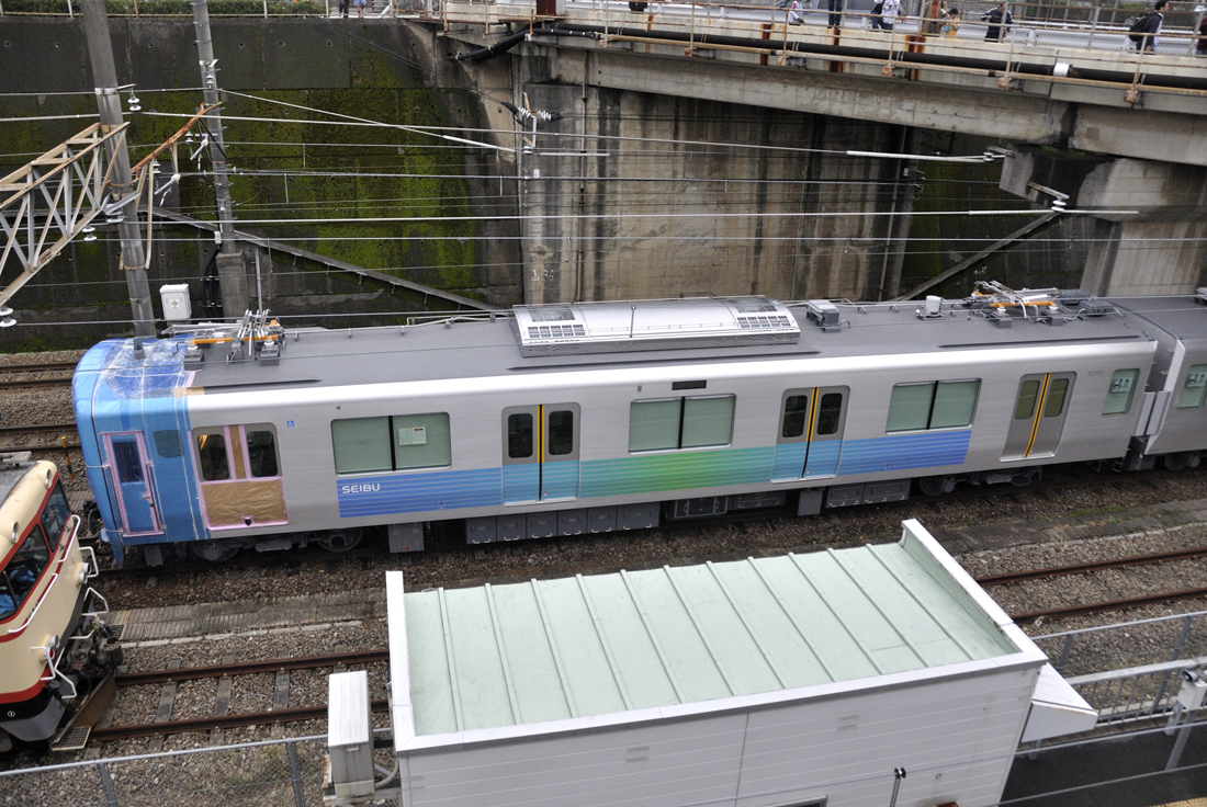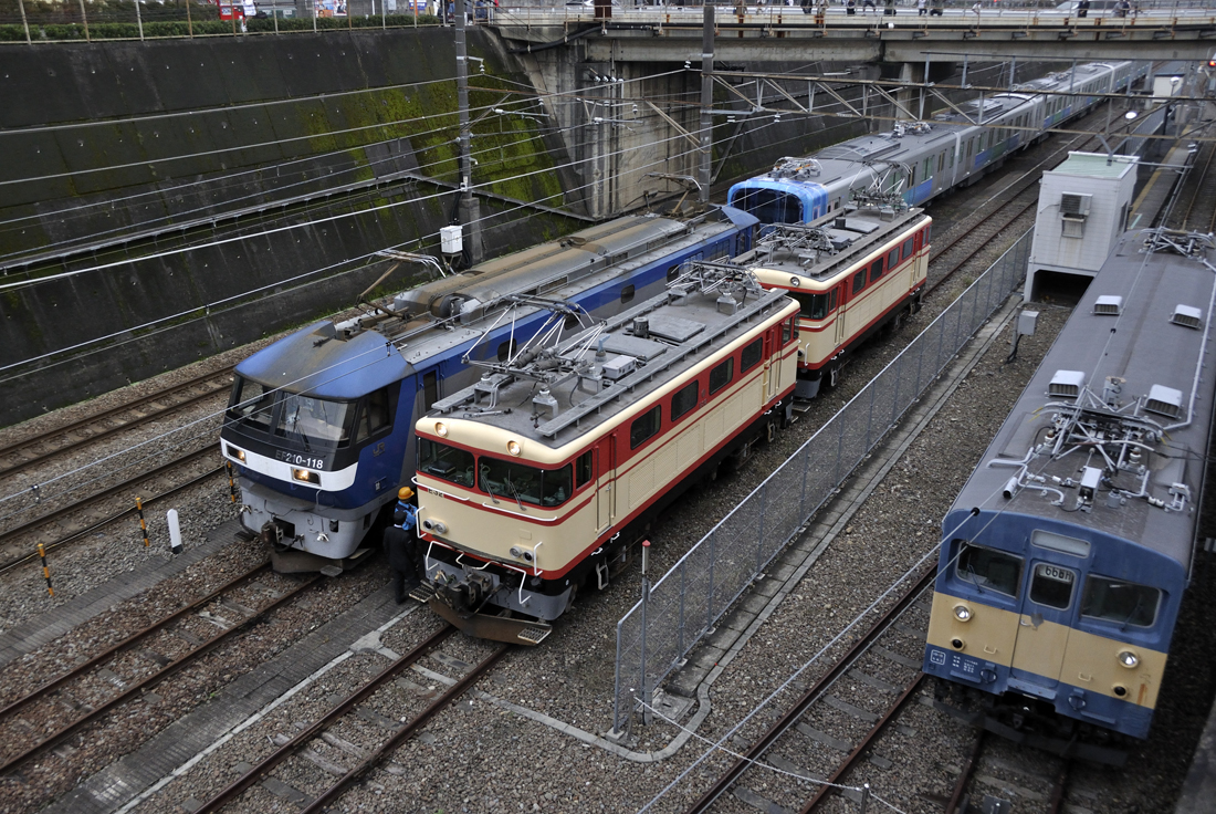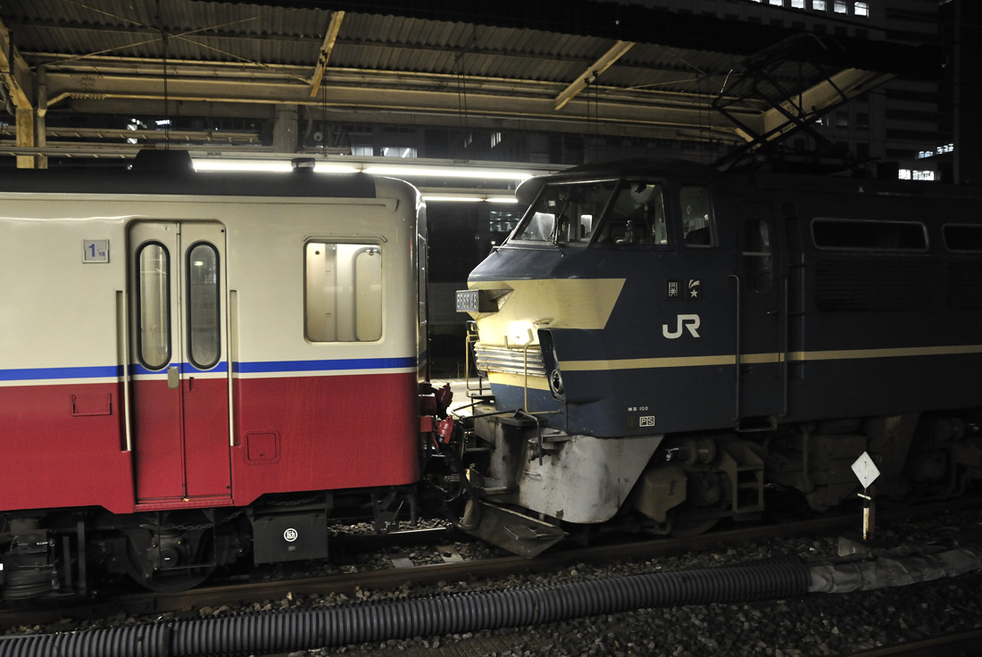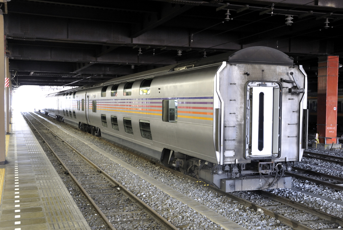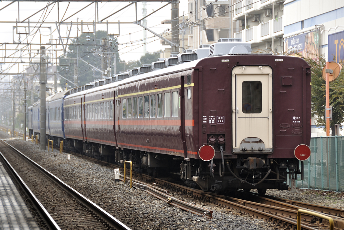28日(火)、寝台特急カシオペアに使用されている客車E26系が大宮工場に入場しました。この日の入場は後ろ側の6両で、前日に前の6両が入場しました。この日の牽引はEF81-81号機でした。中間車を機関車に連結する関係で(中間車は連結器が密連)、ゆうマニが間に挟まった形での入場となりました。