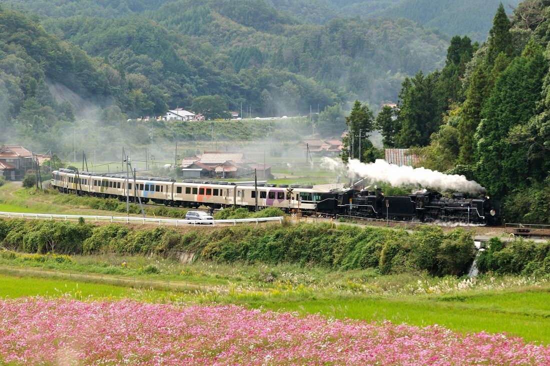 往路は全体的に不作でしたので、この一枚のみ。コスモス畑とSL。重連はやはり迫力アップ。(撮影地:山口線渡川〜三谷)