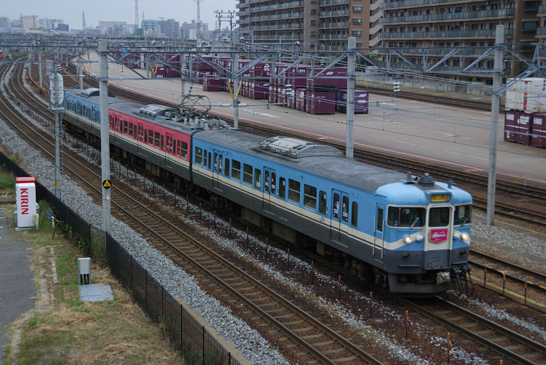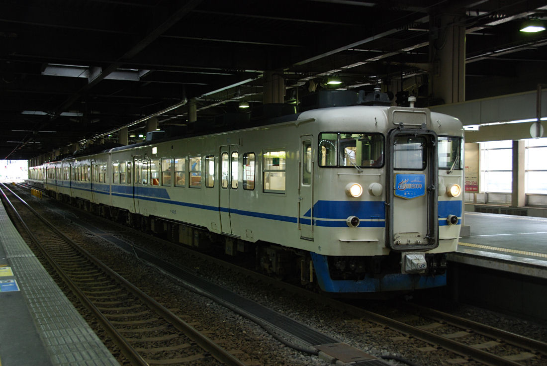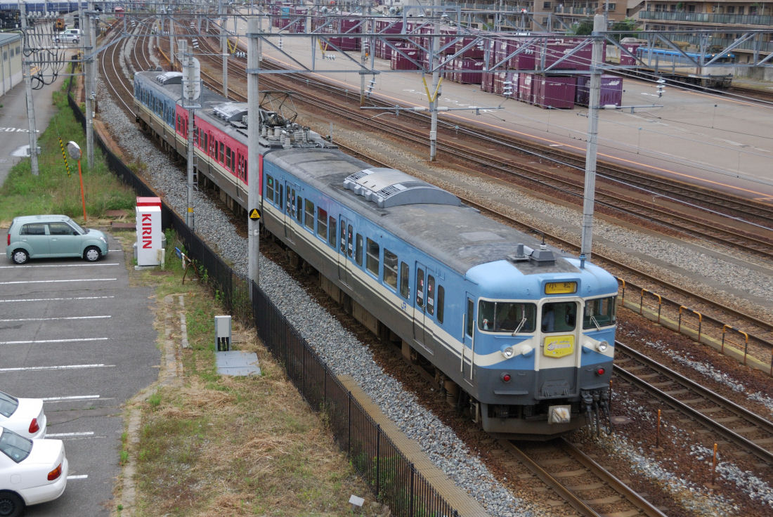 七尾線の415系800番台は網干の113系に交流機器を付けたもので、生粋の415系とは言えないものです。車両形式は同じでも常磐線などで活躍していた415系とは車両のつくりは全く違うものです。この"偽"415系とも言える車両も既に新製から40年を越えています。今年は和倉温泉開湯1200年ということで、記念してヘッドマークが取り付けられています。