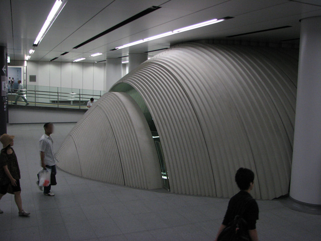楕円形の物体の中にエスカレーターがあります。ここを降りるとプラットホームです。