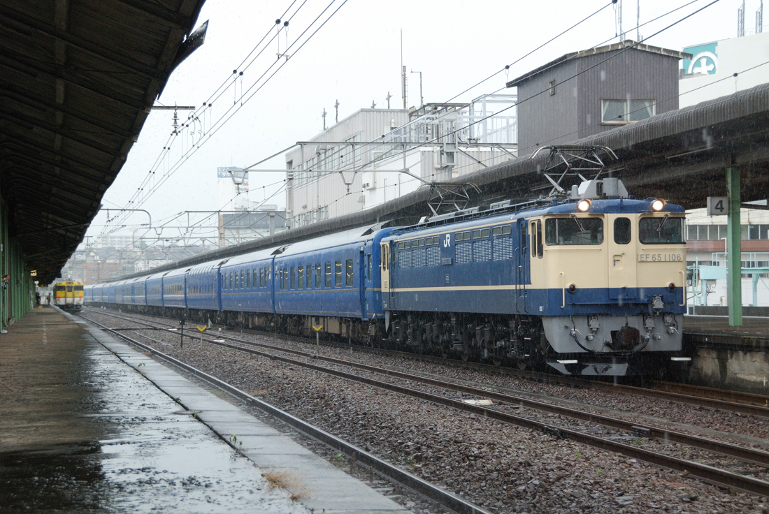 下関駅に侵入するEF65牽引の富士・はやぶさ。今年3月に廃止された「銀河」を思わせる雰囲気です。キハ40系広島色と並ぶ。(撮影地:山陽本線下関駅)