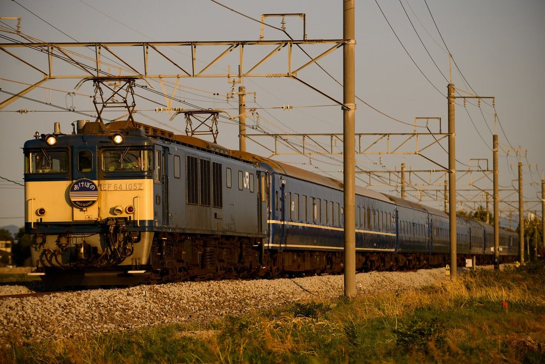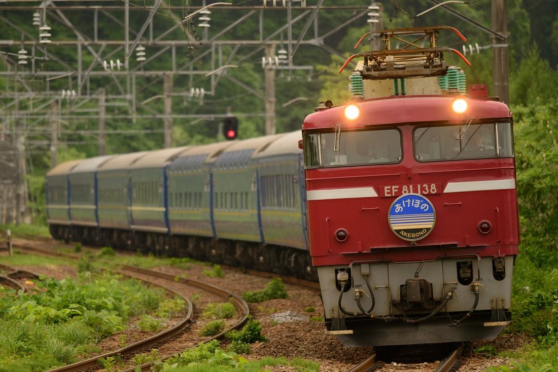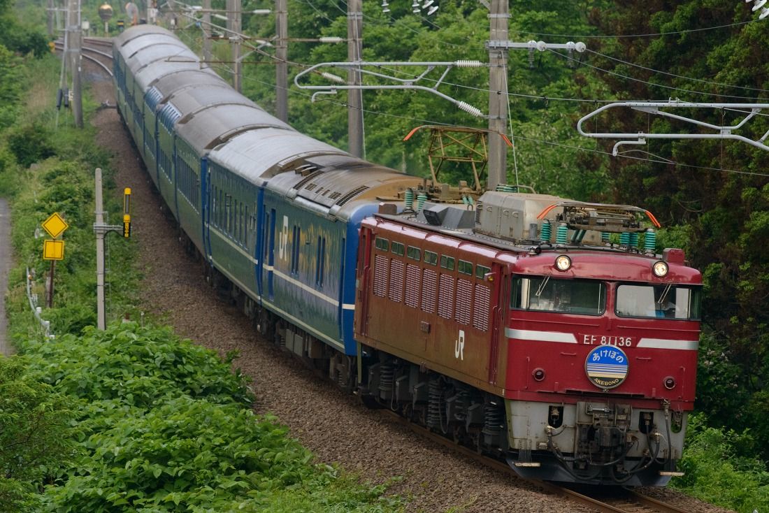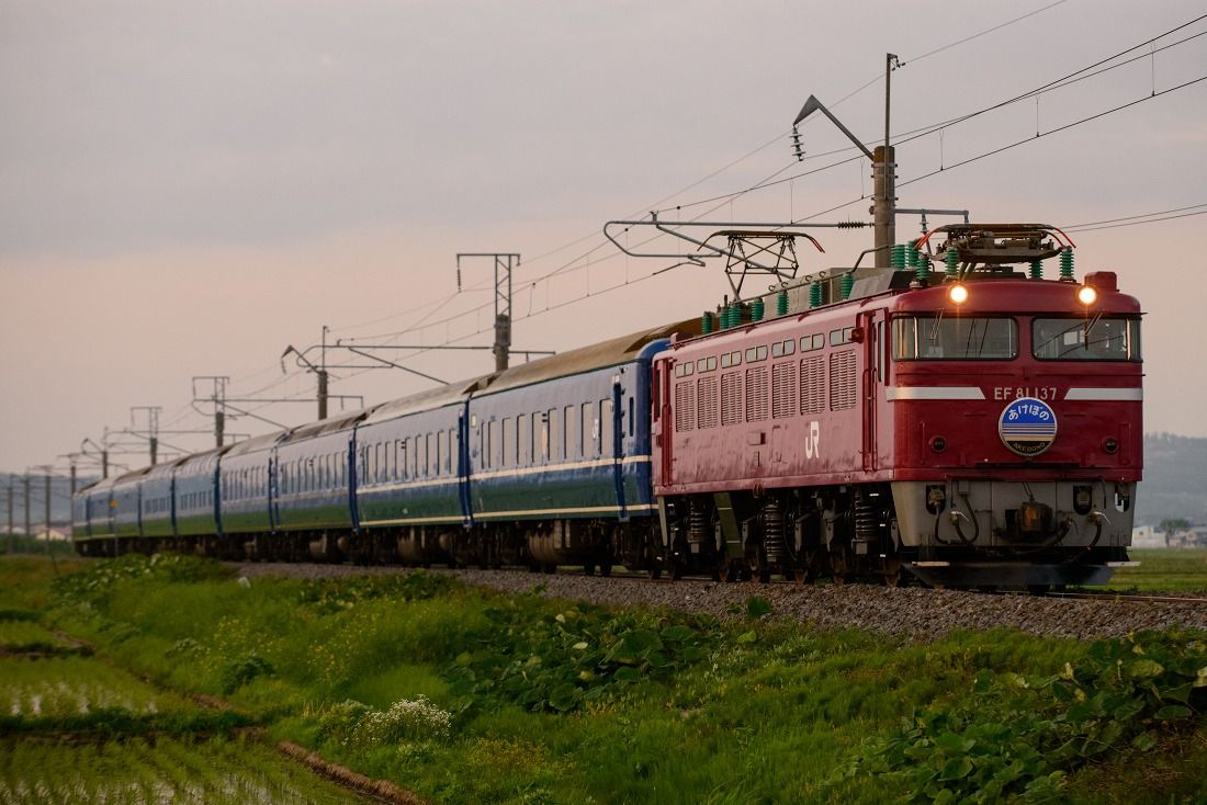 定期列車として廃止された寝台特急あけぼのですが、GWの期間には臨時列車として運転されました。好天に恵まれた5月4日の朝、西目〜仁賀保の俯瞰撮影地へ赴きました。臨時あけぼのは上りの青森発車が1時間繰り上がり、逆に下りは青森到着が1時間以上遅くなりました。その影響もあって、定期時代は夏にしか撮れなかった場所がGWでもらくらく撮影できるようになりました。西目俯瞰もそんなポイントの一つです。