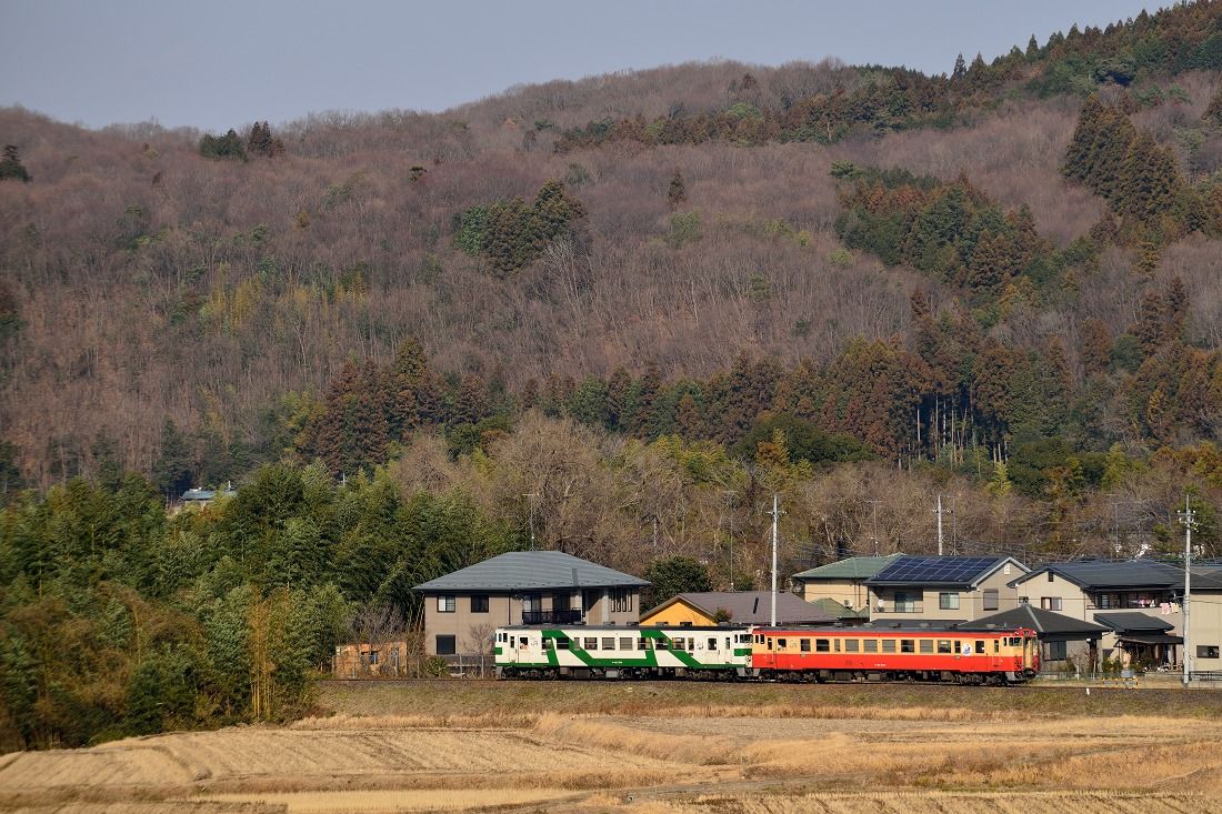 この3連が1両切り離されて、2連でもどってきた姿。(撮影地:烏山線宝積寺〜下野花岡)