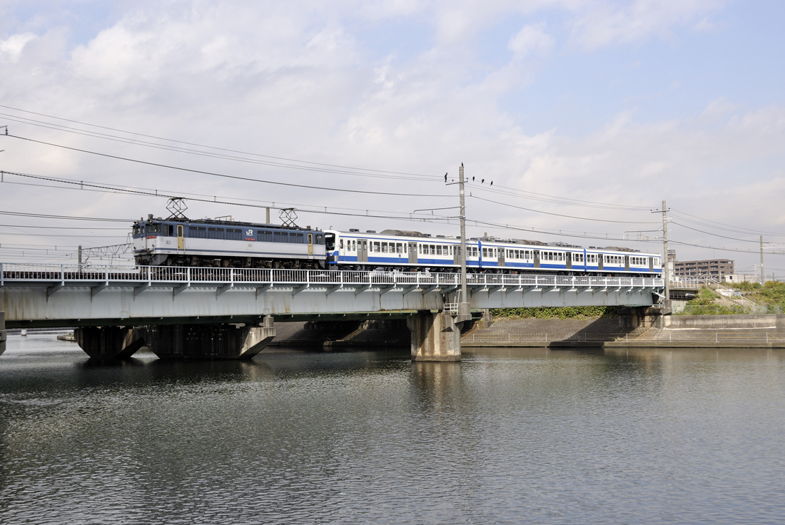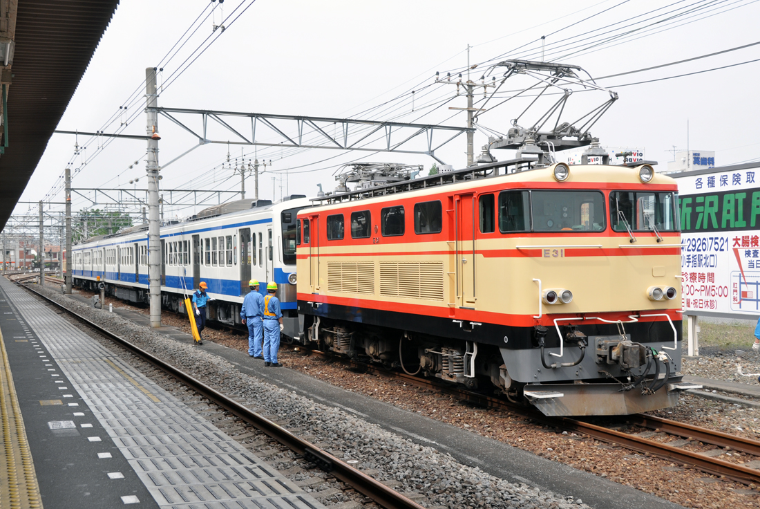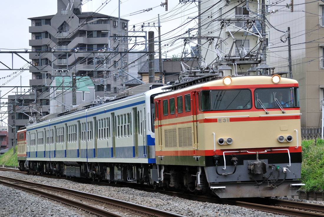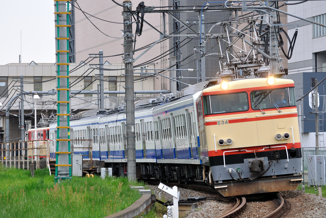 5月12日(火)、横浜羽沢〜三島〜大場間で元新101系伊豆箱根譲渡車の第二編成(伊豆箱根鉄道1300系の第2編成)の甲種輸送が11日に引き続き行われました。横浜羽沢〜三島のJR線内の区間はEF65-1094号機が牽引、伊豆箱根鉄道線内はED31形ED32が牽引しました。