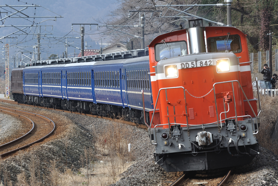 18日、EF55さよならイベントの最後を飾る「さよならEF55横川号」が運転されました。編成はEF55-1+12系6B+DD51-842でした。さよならヘッドマークが取り付けられ、ラストランに相応しい姿でした。高崎駅や横川駅大勢のファンが押し掛け、その他有名撮影地は凄まじい砲列とこれもある意味でラストランらしい光景でした。無事にラストランが終了したことは何よりだと思います。今後は鉄道博物館で保存される模様です。