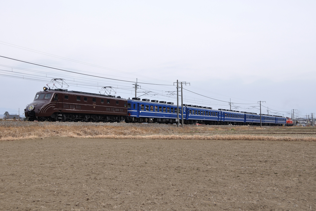 1月17日、「さよならEF55碓氷号」が上野〜横川間で運転されました。編成はEF55-1+12系6B+EF64-1001のPPでした。今回も引退が目前に迫ったEF55-1を撮影するために大勢の人が集まっていました。今回は安中〜磯部間の田園の中から撮影しました。(撮影地:信越線安中〜磯部間)