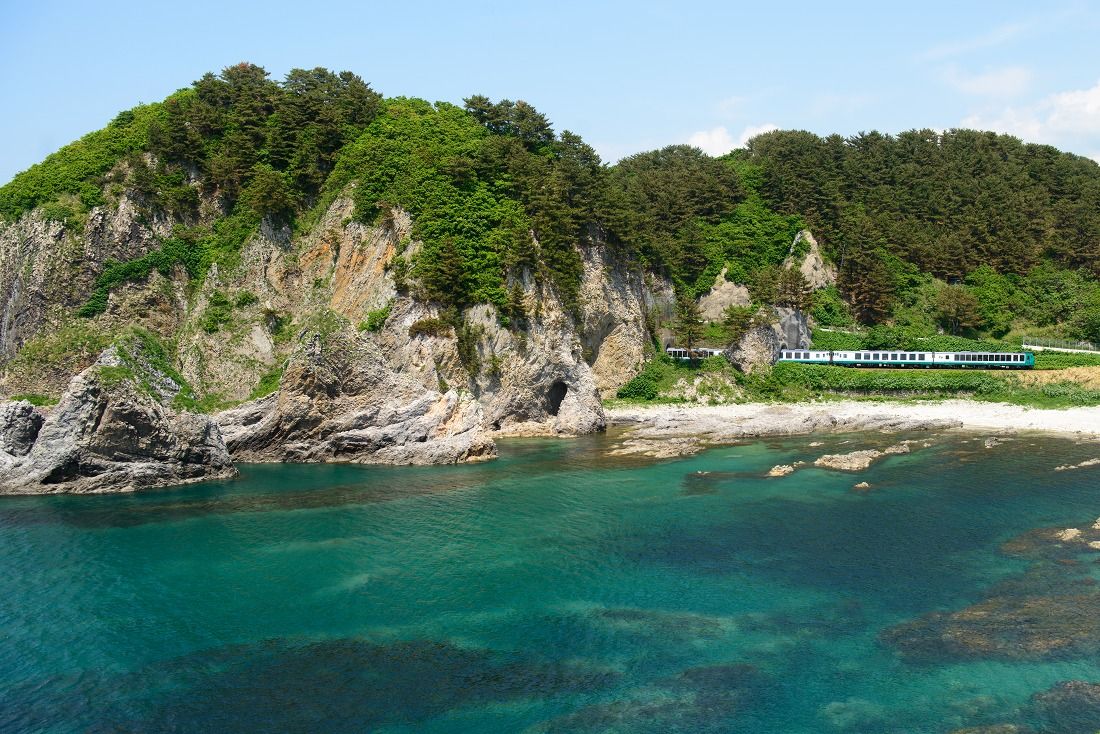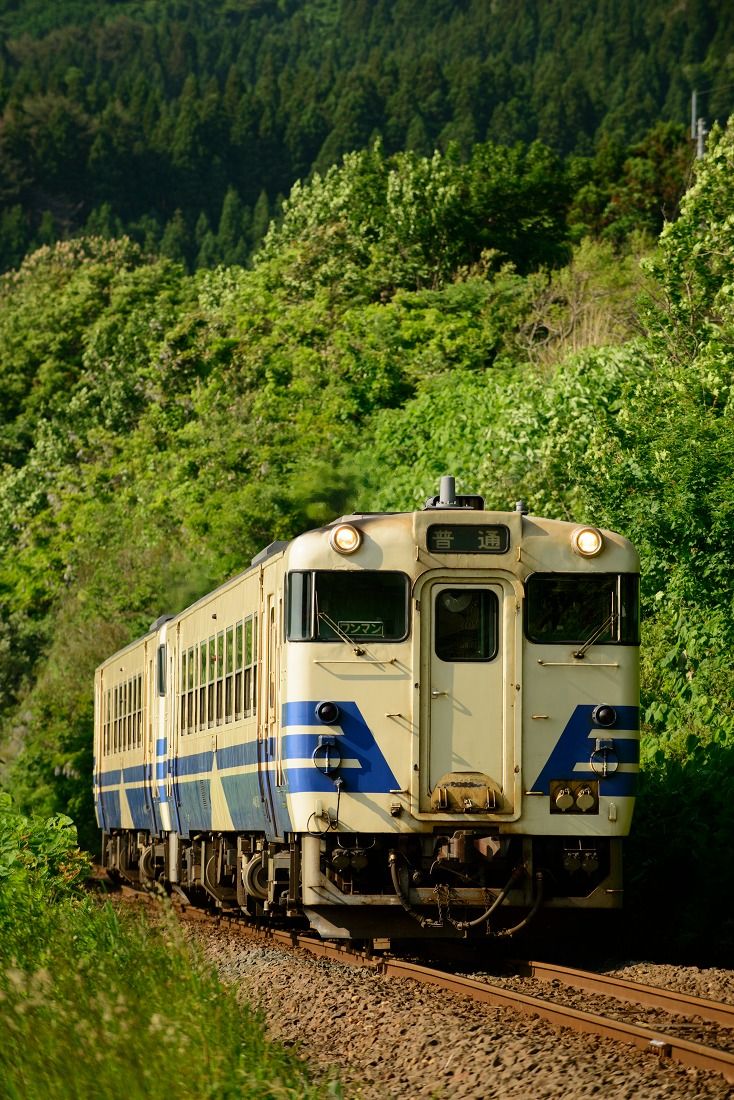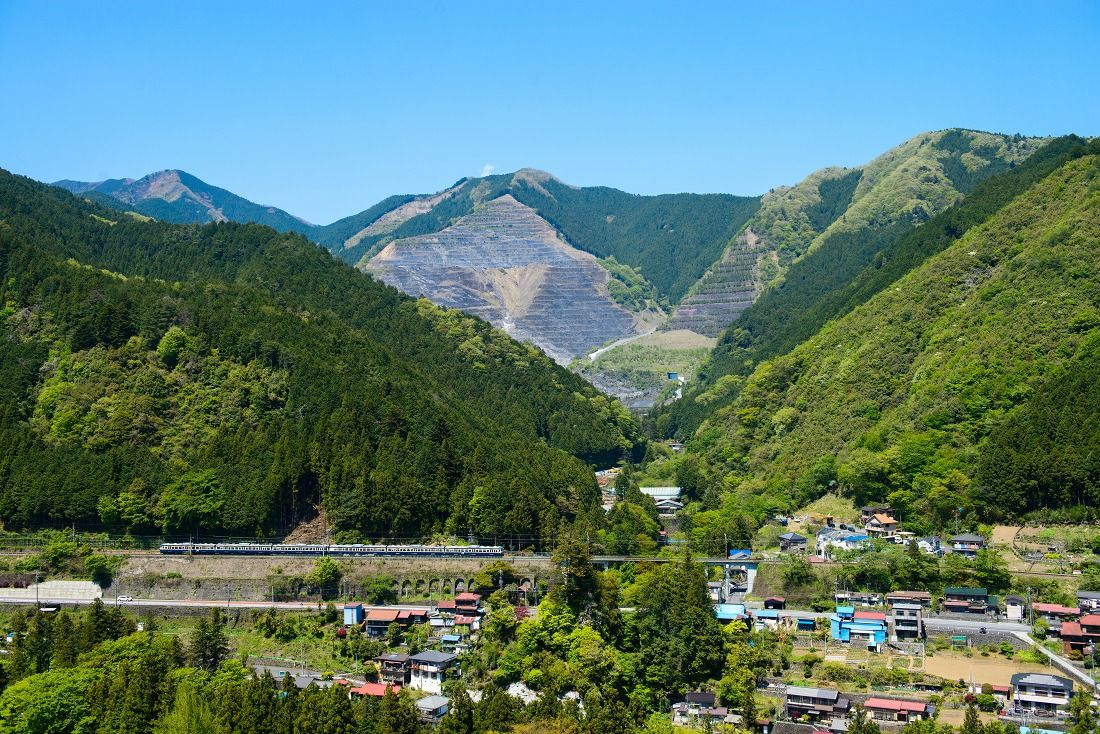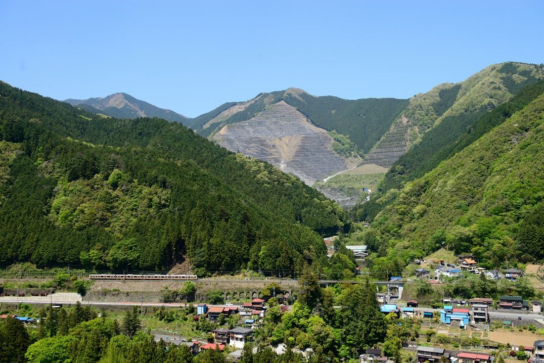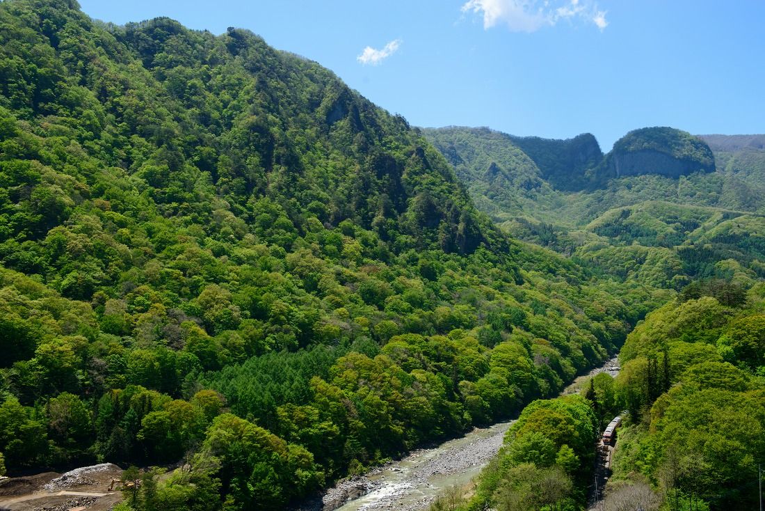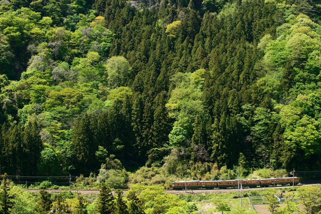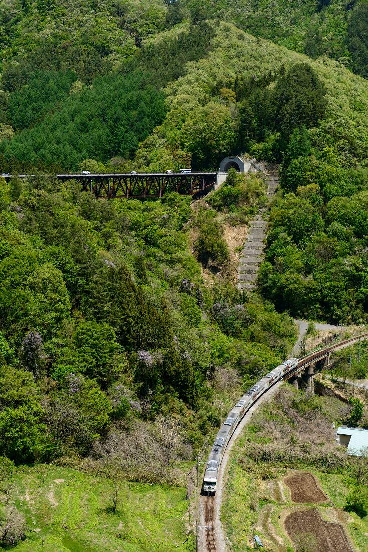かねてから訪れたかった樽沢トンネル俯瞰ですが、イマイチ場所がつかめず昨秋は行くことができませんでしたが、今回はしっかり事前に調べて山を登りました。なかなか登るのが大変な斜面でしたが、登った甲斐のある風景が広がっていました。まさに緑の絨毯といったところでしょうか。(撮影地:吾妻線岩島〜川原湯温泉)