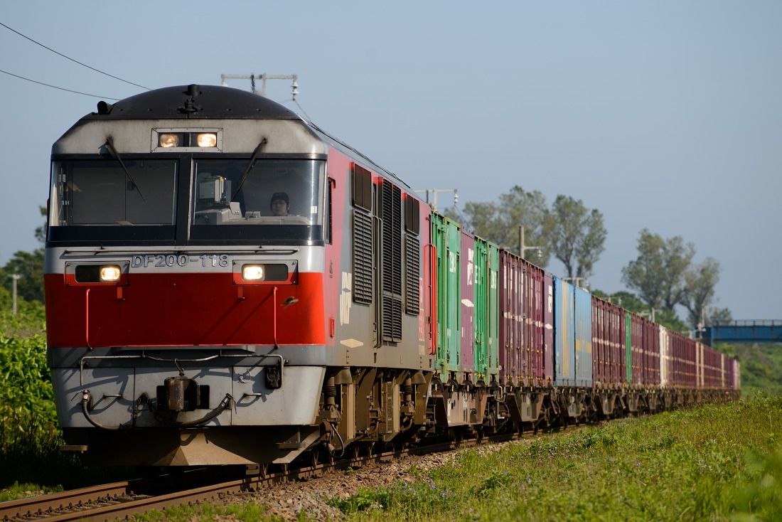 まずは6月29日の北舟岡。北舟岡は北海道の太平洋側でも比較的晴れやすいエリアと言われており、この日も昼過ぎから天候が急速に回復。DF200の貨物。(撮影地:室蘭本線北舟岡〜伊達紋別)