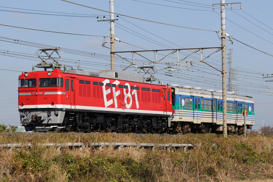 11月25日、久留里線で普段使われているキハ30-62が郡山総合車両センターに入場するため、木更津→新小岩(操)→郡山の経路で配給されました。新小岩(操)からはEF81-95号機、いわゆる虹ガマが牽引しました。久留里線のキハ配給は通常ならば、新小岩(操)〜黒磯がEF65、黒磯以北はED75となることが通例のようですが、カマのやりくりがつかなかったのかわかりませんが、今回はEF81が通しで牽引しました。