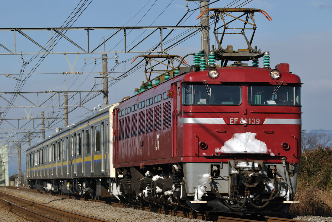 バリ順、雪付きで北陸を撮影できると思いもしませんでした。パンタの抜き位置は一応思い通りだったのですが、頭を架線柱に掛ける切り位置は何か微妙な感じが致しました。それでも夏場でないと走行写真が厳しい列車なだけに、大変満足した撮影でした。(撮影地高崎線神保原〜新町間 3012レ)