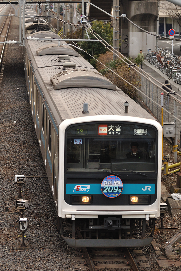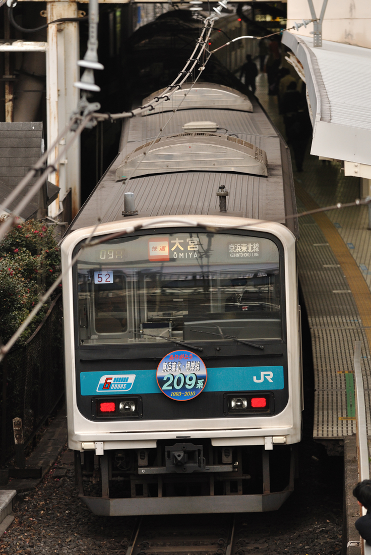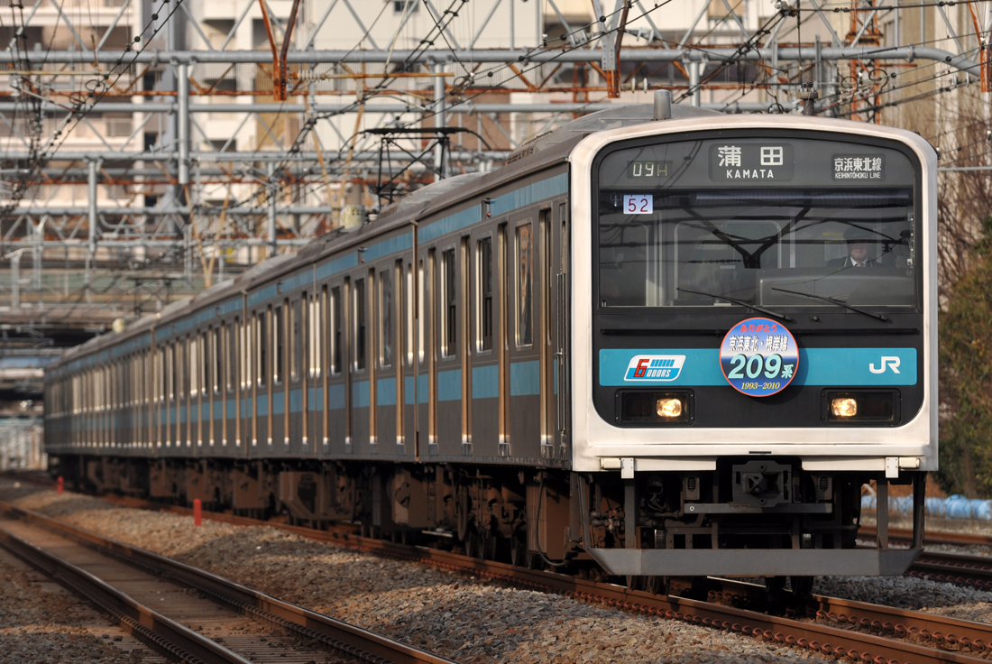 1月17日から24日までの間、ありがとう 京浜東北・根岸線209系と描かれたヘッドマークがウラ52編成に掲出されています。24日を持って京浜東北線・根岸線からは209系が引退する予定となっています。コスト半分、寿命半分で設計された209系ですが、そのコンセプトに基づき登場から17年で京浜東北線から姿を消すこととなります。
