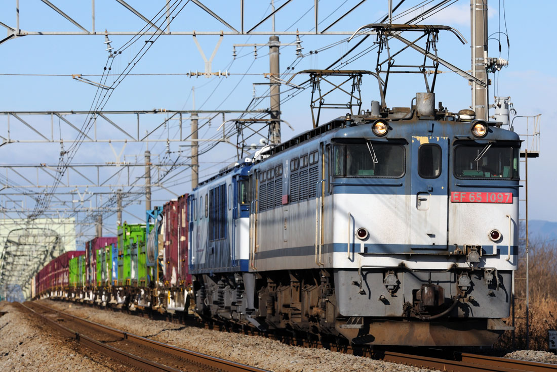 直前の貨物列車でパンタの抜き位置を色々試して見るも定まらず。EF65-1097号機とEF64-1000番台の更新機の重連。(撮影地高崎線神保原〜新町間)